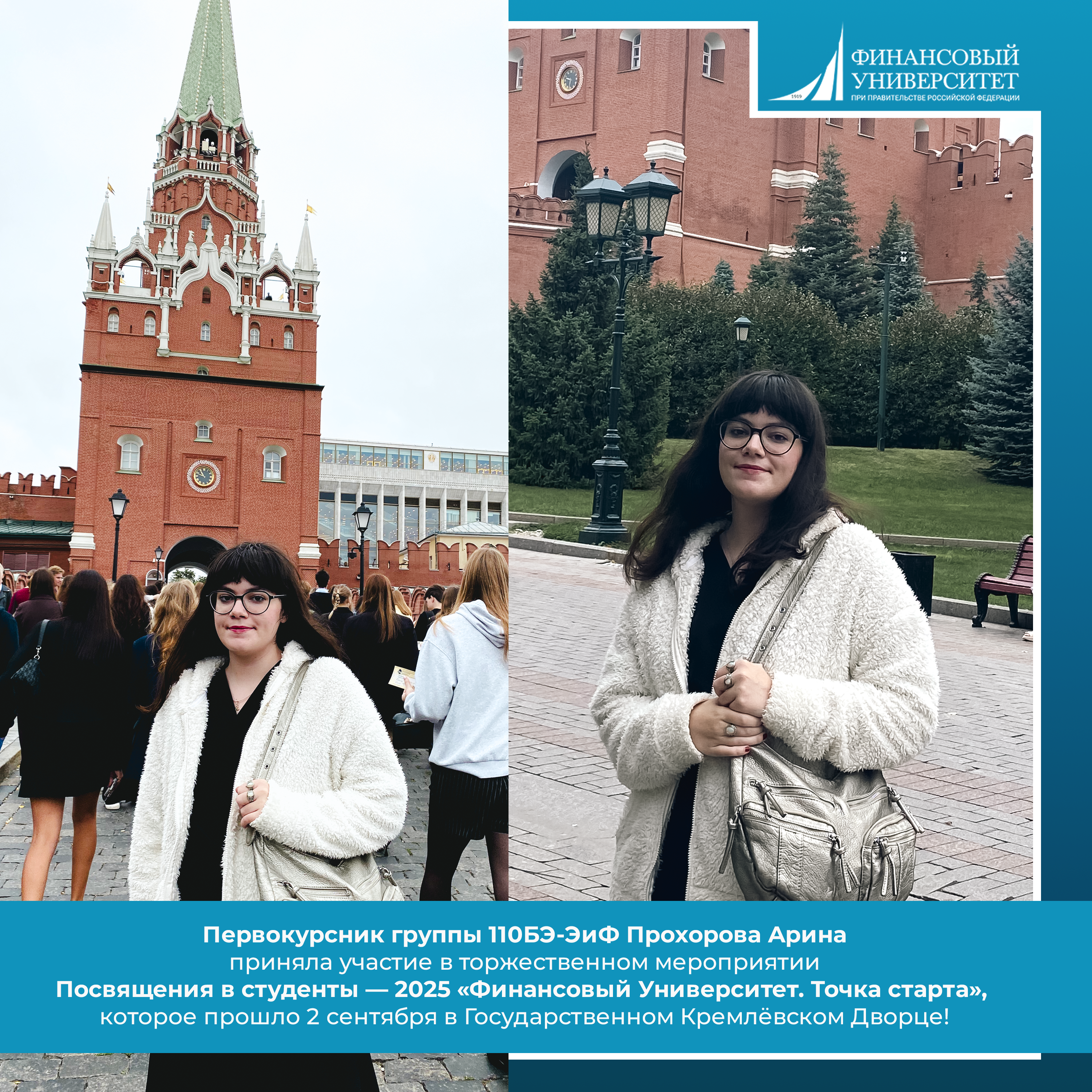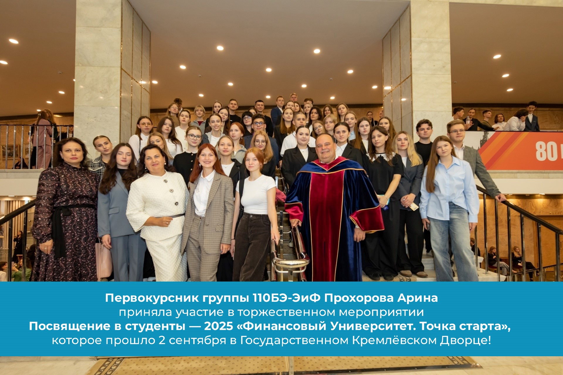 2 сентября 2025 года в Государственном Кремлёвском Дворце состоялось торжественное мероприятие «Финансовый Университет. Точка старта», посвященное началу нового учебного года. Финуниверситет в городе Уфа с гордостью сообщает, что в этом знаковом событии приняла участие первокурсница группы 110БЭ-ЭиФ Прохорова Арина.