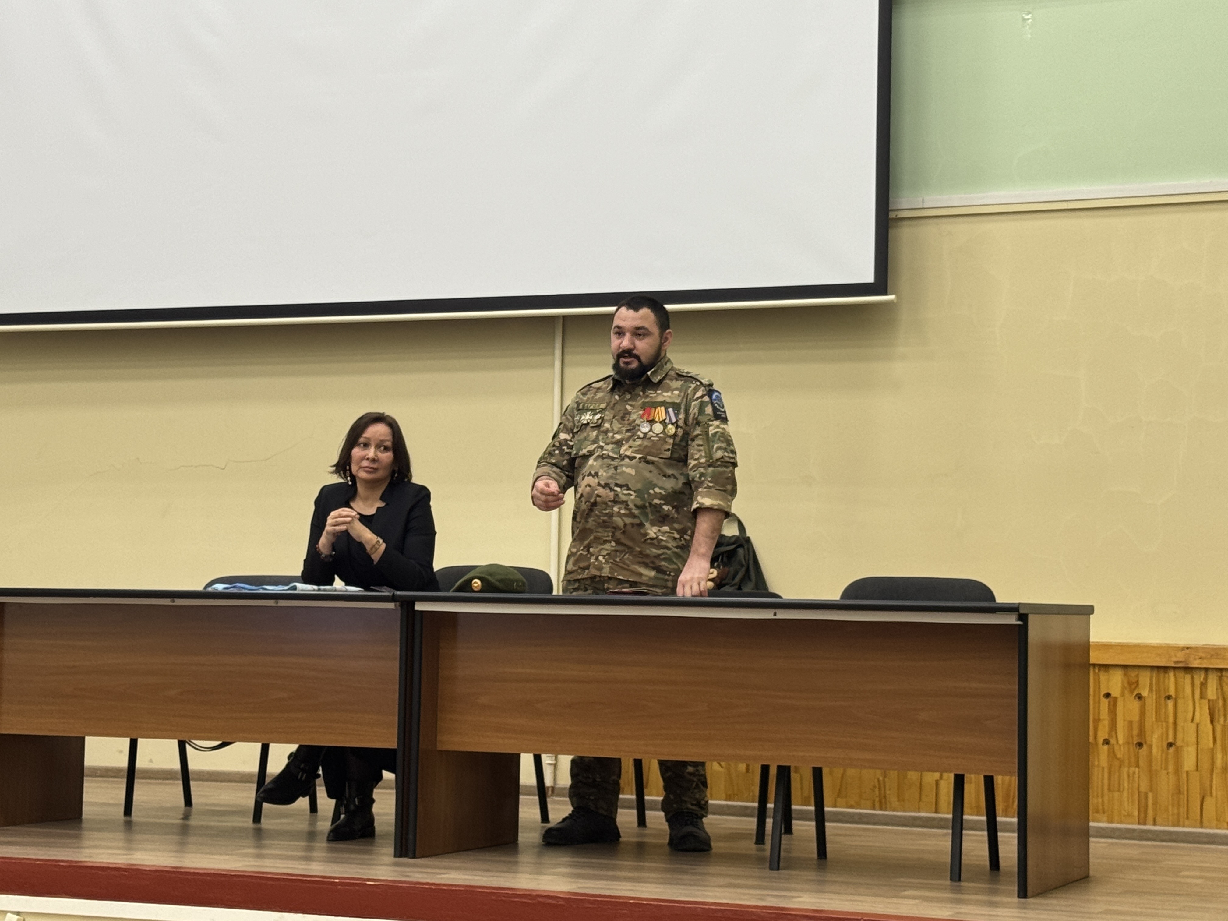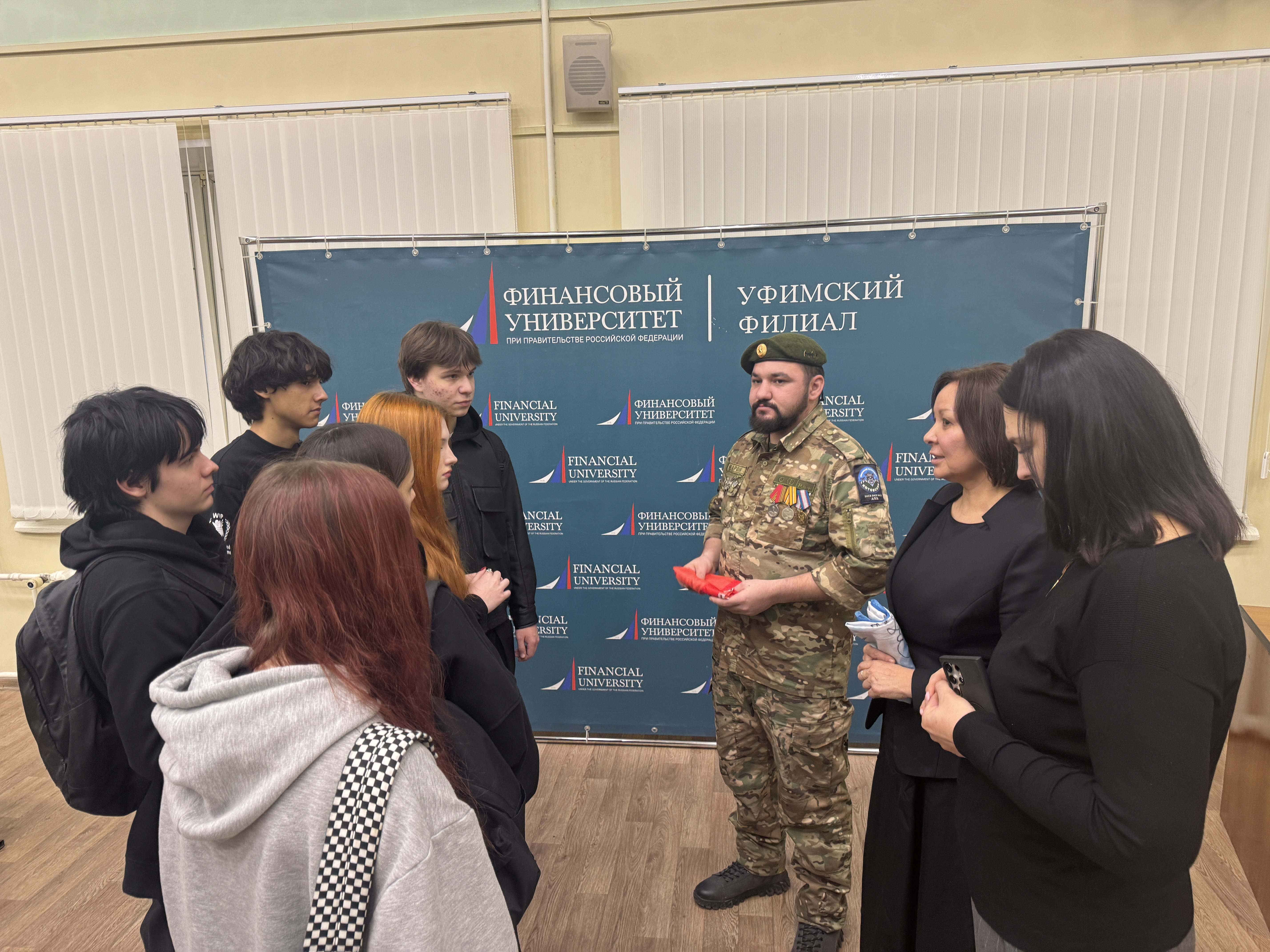 7 ноября 2025 г. в Уфимском филиале Финансового университета при Правительстве Российской Федерации состоялась встреча с участником боевых действий в зоне СВО, членом правления Калининского отделения Всероссийской общественной организацией ветеранов «Боевое Братство» – Капитоновым Алексеем Валерьевичем, позывной «Барон» и Уельдановой Гульназирой Разаковной - волонтером СВО, заместителем генерального директора Акционерного общества «Центр развития и спорта «Октябрьский».