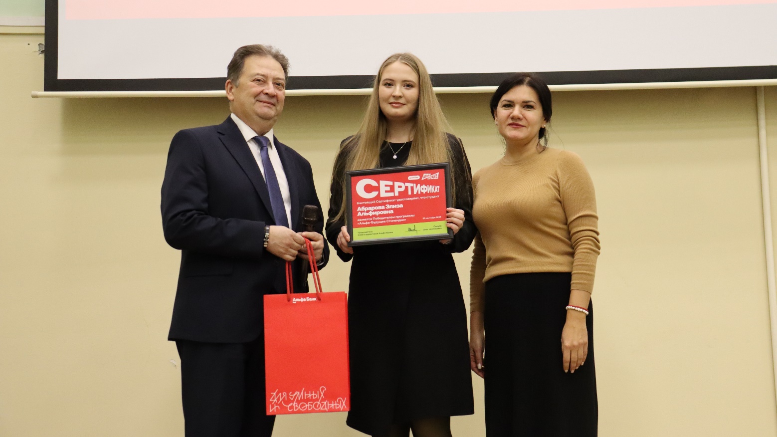 От лица партнёра с напутственной речью выступил директор по розничному бизнесу Альфа-Банка Олег Дмитриевич Федяков. Он поздравил победителей конкурсного отбора, отметив их высокие академические и лидерские достижения, после чего лично вручил именные стипендии лучшим студентам — выпускникам программы «Альфа-Будущее. Стипендии».